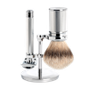 MÜHLE TRADITIONAL Shaving Set bao gồm 3 sản phẩm cao cấp hỗ trợ việc cạo râu cơ bản: 1 dao cạo râu TRADITIONAL, 1 chổi quét kem TRADITIONAL và 1 giá đỡ cùng loại.